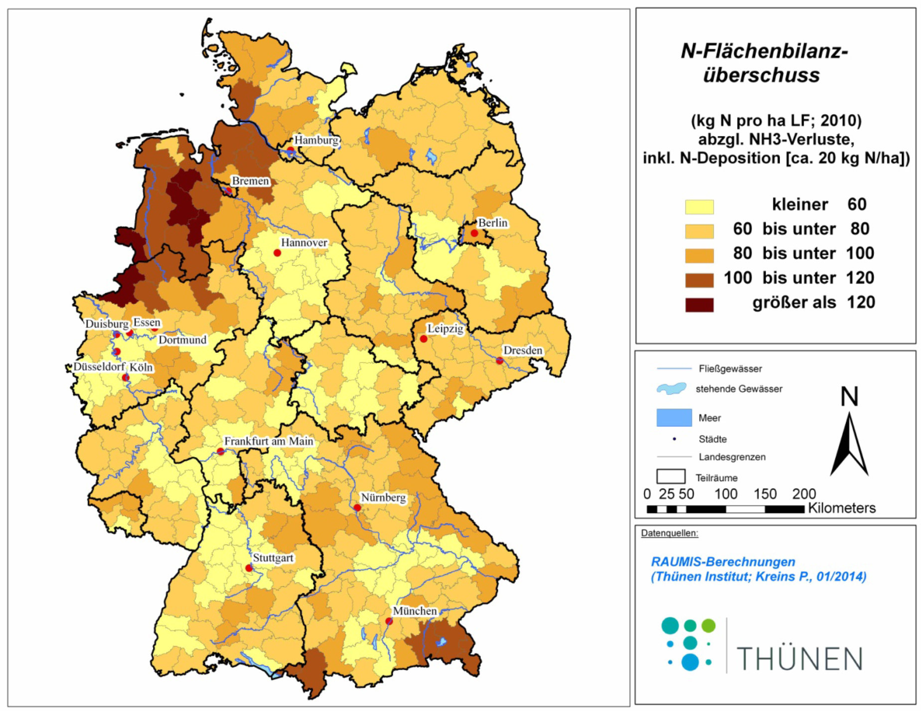 Stickstoff-Flächenbilanzüberschuss 2010 in Deutschland